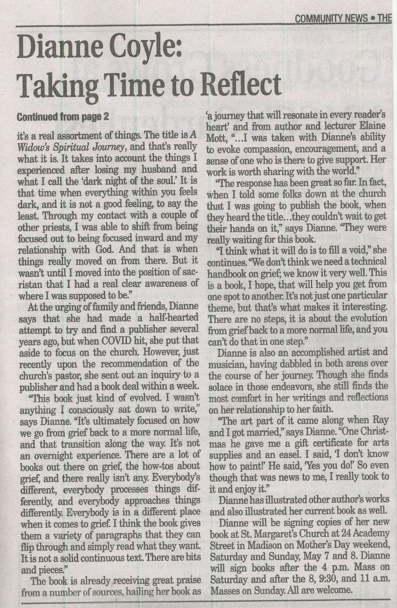 “When Dianne began sharing her writings with me, I was taken with her ability to evoke compassion, encouragement, and a sense of one who is there to give me support. Her work is worth sharing with the world.” – Elaine M. Mott, M.A. Moral Theology from St. Charles Borromeo Seminary, (Overbrook) Philadelphia, PA. Elaine has served as a Director of Religious Education, addressed seminars for new DREs, and currently directs the Rite of Christian Initiation of Adults in the Archdiocese of Philadelphia.